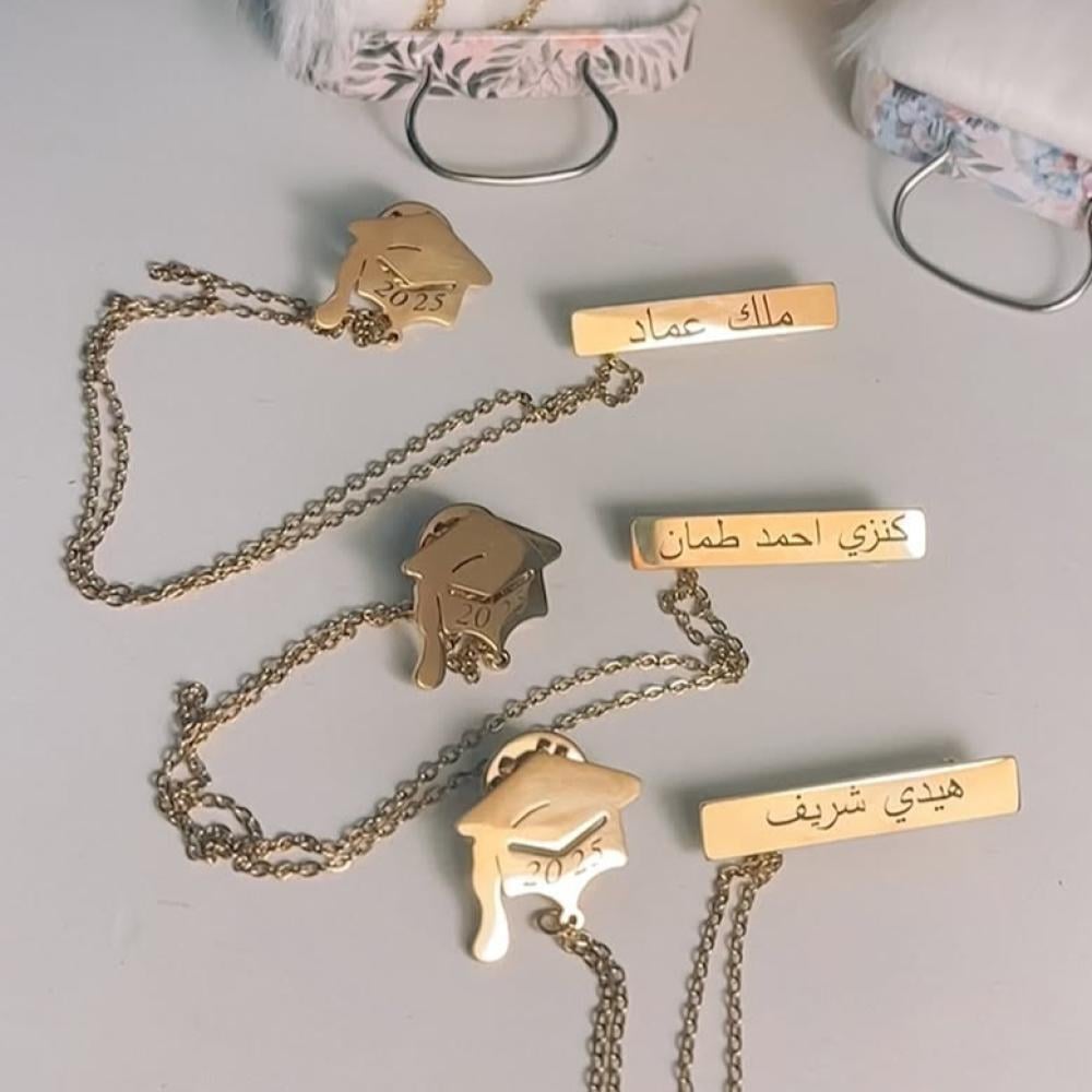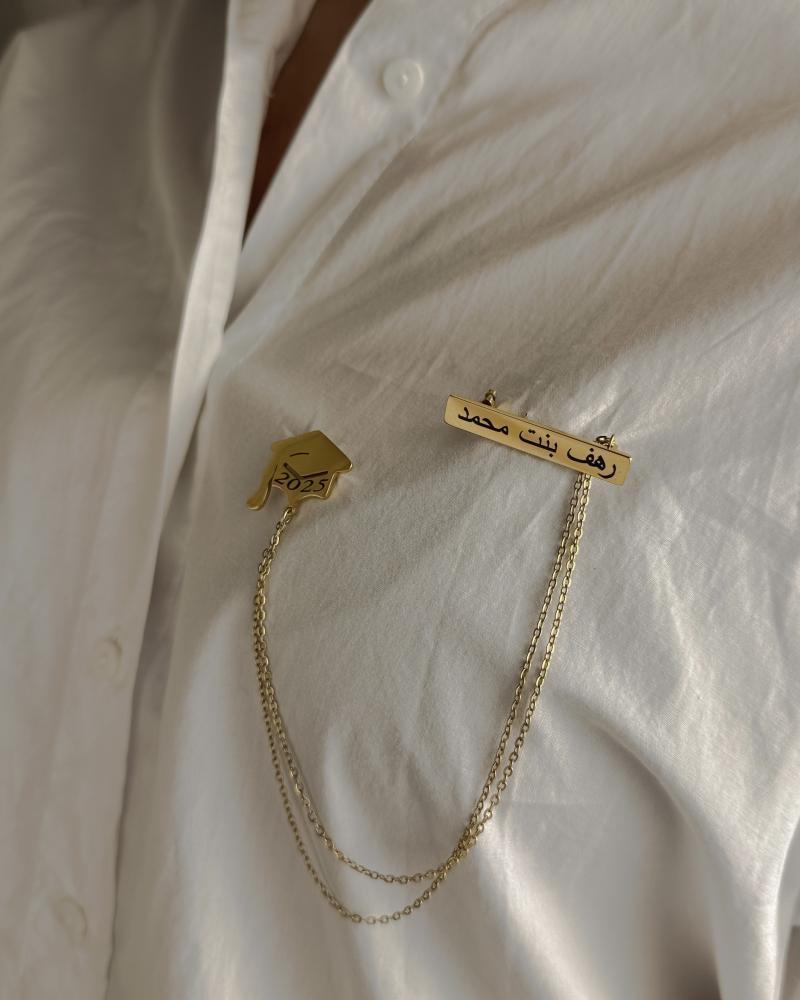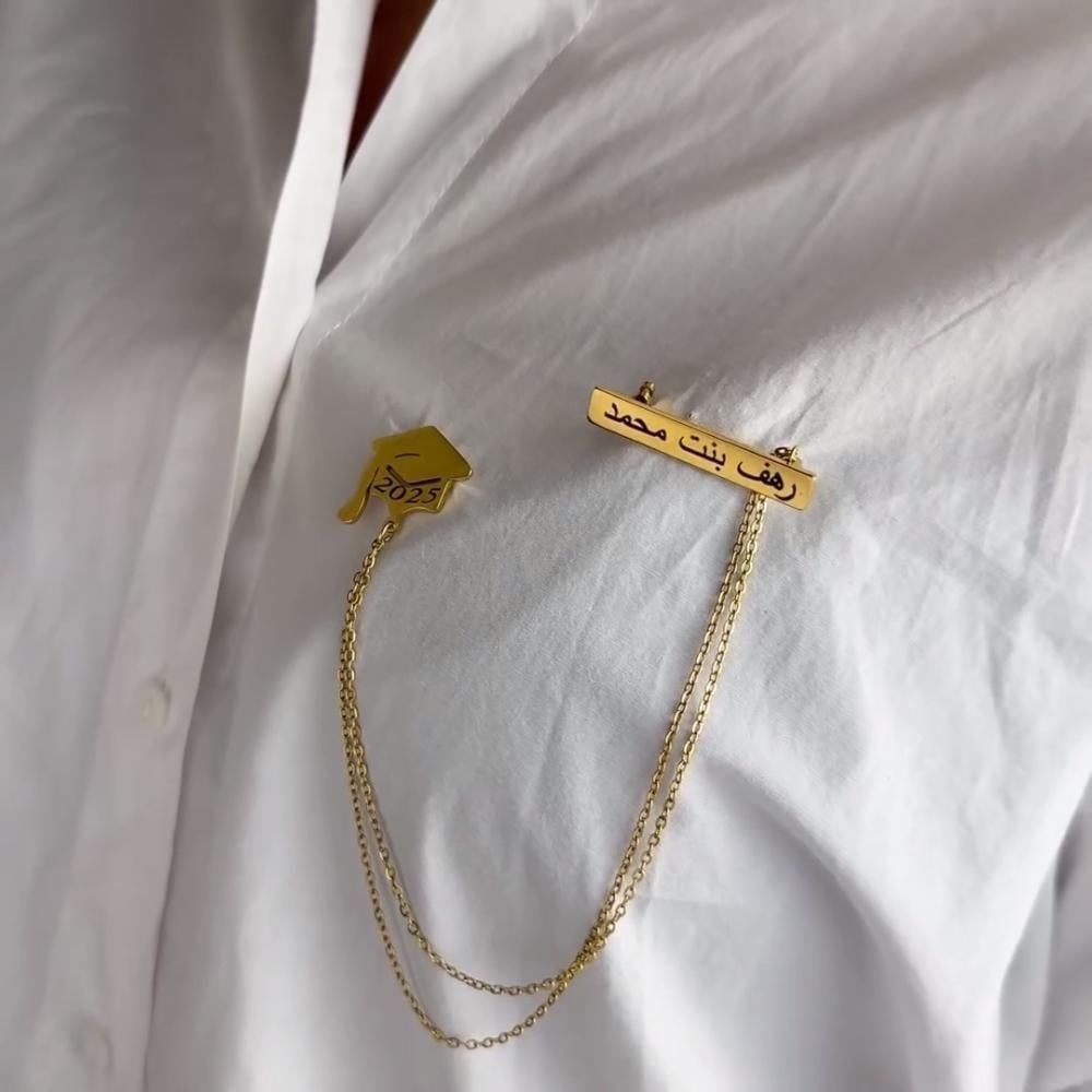 لإطالالة بهية ومكتملة في حفلة تخرجك.تصميم البروش عصري وانيقبروش بالاسم تخرج 2025مطلي ذهب عيار 21كتابه الاسم حسب الطلبمتوفر لونين فضي ذهبيضمان الون مدى الحياةيأتي بعلبه فاخره وكيس عليها شعار ملكة