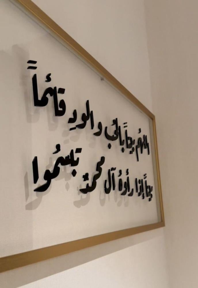 منسوجة بخط عربي بارز يعكس جمالية الحروف ودقة التصميم، ومحاطة بإطار أسود أنيق يضيف عمقًا بصريًا للمكان.