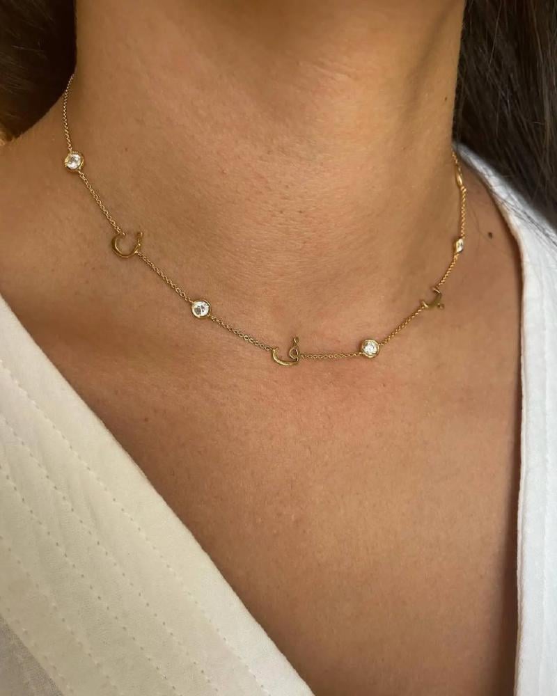 اجعل كل لحظة مميزة مع سلسال الأحرف المزين بالفصوص من متجر ملكه، الذي يضيف لمسة من الأناقة والتفرد إلى إطلالتك. صُمم هذا السلسال ليكون تعبيرًا عن شخصيتك، حيث يمكنك اختيار الحرف الذي يمثل اسمك أو اسم شخص عزيز عليك، لتظهر بإطلالة فريدة ومميزة في كل مناسبة.