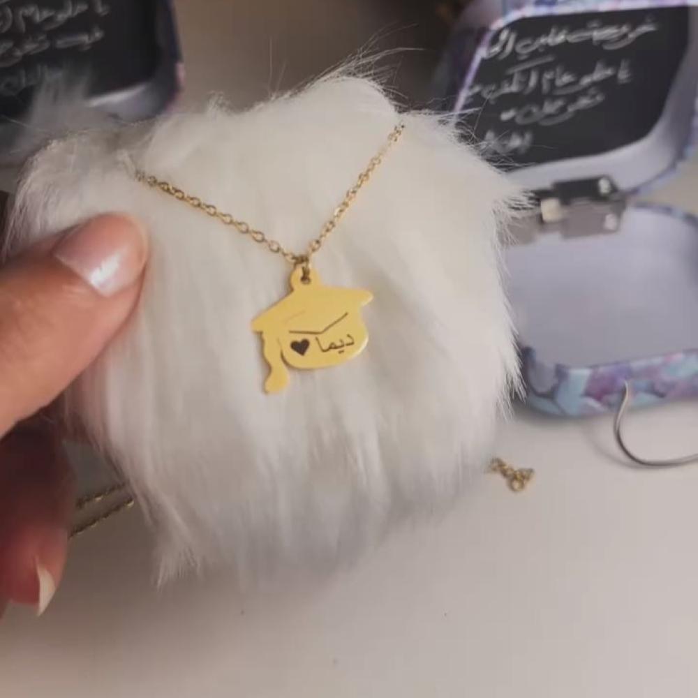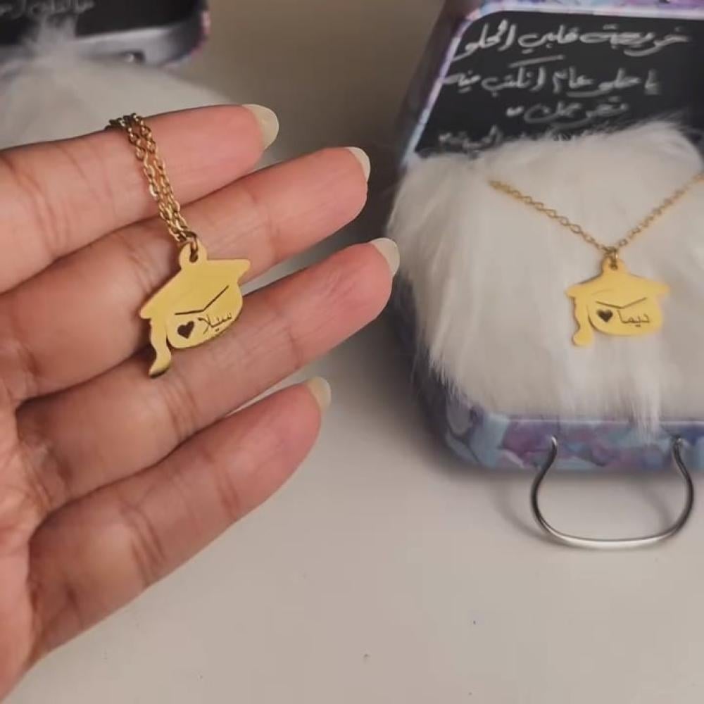 أجمل إهداء للخريجين بالاسم .معلومات المنتج:. مطلي بالذهب عيار 21 قيراط.. إمكانية كتابة الاسم حسب الطلب.. متوفر ذهبي أو فضي.. ضمان سنتين على اللون من ملكة.. ياتيكم بتغليف شيك وجميل